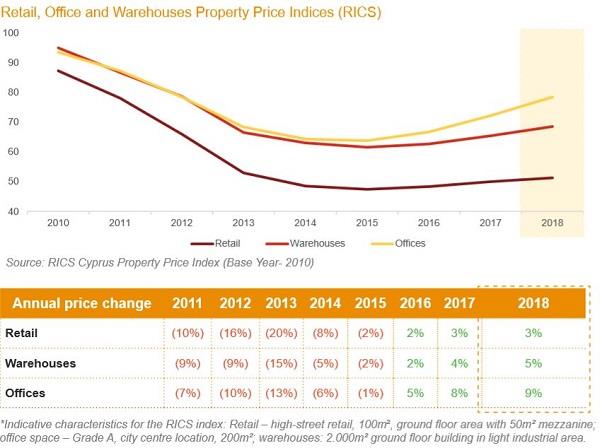 Όσον αφορά τις τιμές των εμπορικών ακινήτων στην Κύπρο, αυτές καταγράφονται από το δείκτη τιμών RICS, ο οποίος καλύπτει τα καταστήματα λιανικής, τις αποθήκες και τους χώρους γραφείων. Το 2018 οι τιμές για τα γραφεία συνέχισαν να αυξάνονται, παρουσιάζοντας ετήσια αύξηση 9%- αντανακλώντας κυρίως την αυξανόμενη ζήτηση για γραφειακό χώρο Βαθμού Α.