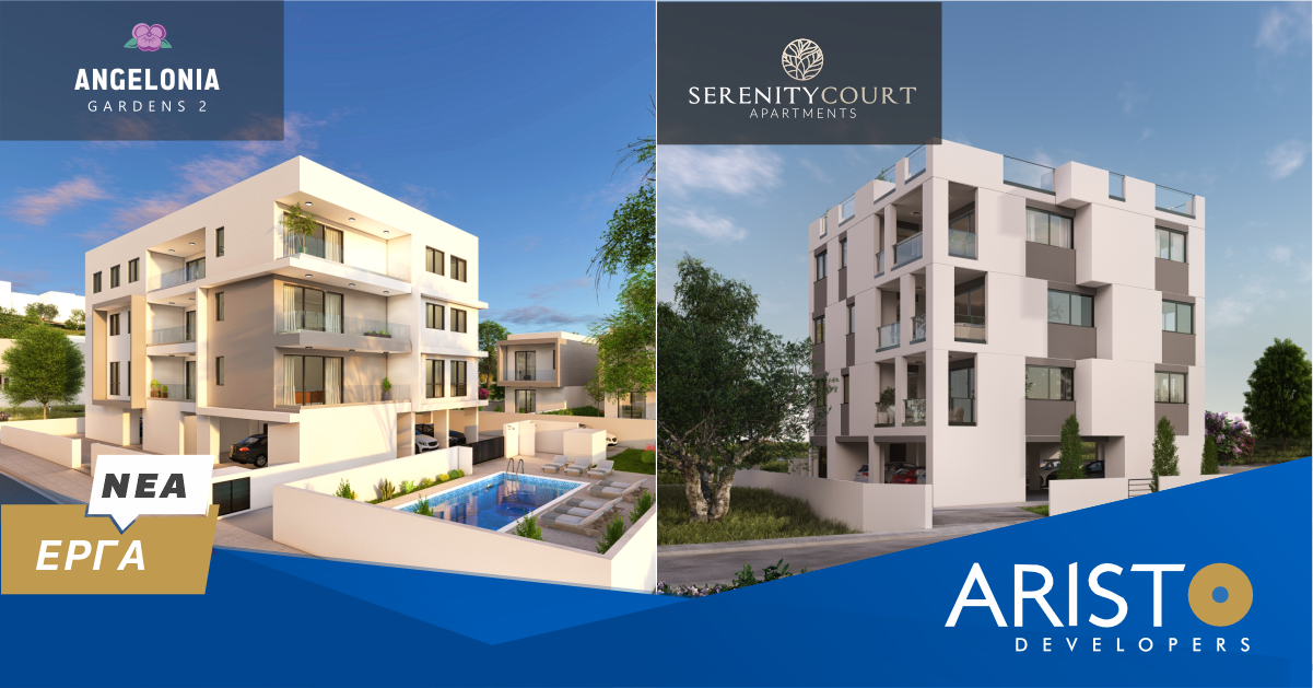 Η Aristo Developers ανακοινώνει την έναρξη πωλήσεων δύο νέων οικιστικών έργων σύγχρονου σχεδιασμού στο κέντρο της πόλης της Πάφου.Πρόκειται για το Angelonia Gardens 2 και το Serenity Court.