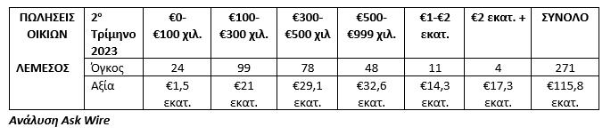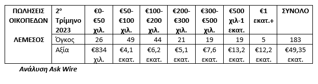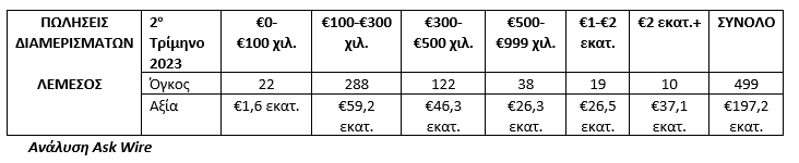 Η Ask Wire, εταιρεία η οποία συνδυάζει την τεχνογνωσία στον τομέα των ακινήτων με την αξιοποίηση της τεχνολογίας, ανέλυσε και παρουσιάζει τα στοιχεία που αφορούν στον όγκο και την αξία των πωλήσεων διαμερισμάτων, οικιών, χωραφιών και οικοπέδων στην επαρχία Λεμεσού κατά το δεύτερο τρίμηνο του 2023.