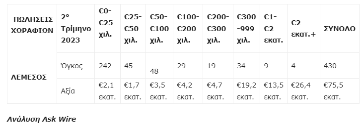 Σχεδόν επτά στα δέκα χωράφια που πωλήθηκαν το δεύτερο τρίμηνο του 2023 στην επαρχία Λεμεσού ήταν αξίας μέχρι €50.000, ενώ τα περισσότερα από αυτά (242 χωράφια/ τεμάχια) πωλήθηκαν σε τιμές κάτω των €25.000. Στην ανάλυση των πωλήσεων με βάση την έκταση διαφαίνεται ότι το ¼ των πωλήσεων αντιστοιχούν σε χωράφια μέχρι 1000 τετραγωνικά μέτρα. Συνολικά 68 χωράφια ήταν έκτασης πέραν των 10.000 τετραγωνικών μέτρων. Η Λεμεσός συγκέντρωσε το 34,6% του όγκου και 46,7% της αξίας των πωλήσεων χωραφιών Παγκύπρια.