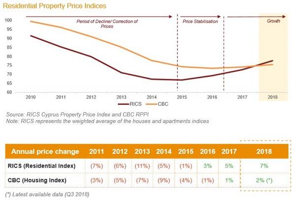 Σύμφωνα με την έκθεση «Cyprus Real Estate Market» της PwC για το 2018, οι τιμές των κατοικιών σε ολόκληρη την Κύπρο, οι οποίες καταγράφονται από δύο δείκτες, της Κεντρικής Τράπεζας Κύπρου (ΚΤΚ) και του RICS (Royal Institution of Chartered Surveyors), το τρίτο τρίμηνο του 2018 παρουσίασαν αύξηση για 12ο συνεχόμενο τρίμηνο σύμφωνα με τον δείκτη RICS και 9ο συνεχόμενο τρίμηνο σύμφωνα με το δείκτη της ΚΤΚ.