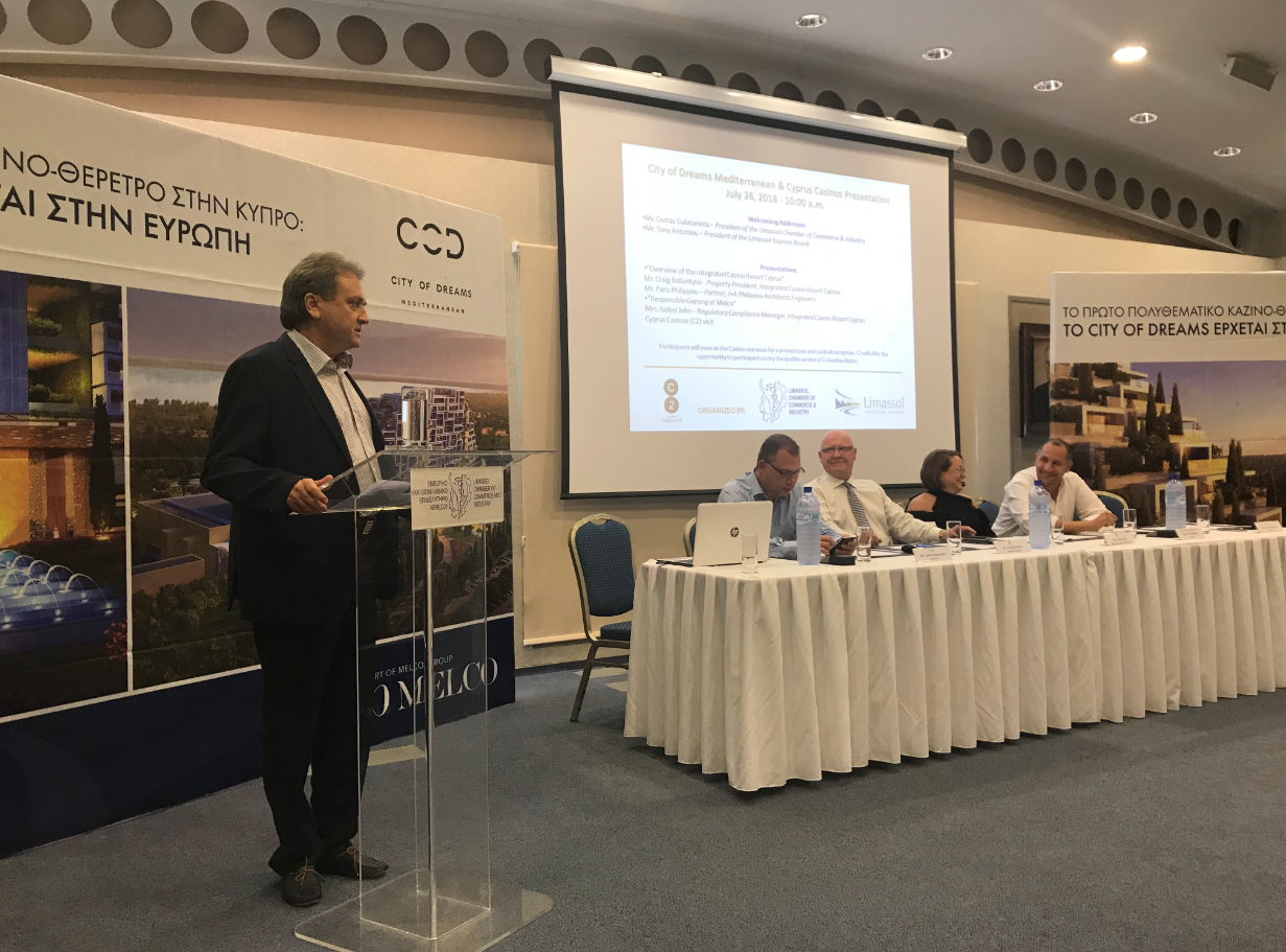 Το Εμπορικό και Βιομηχανικό Επιμελητήριο Λεμεσού και η Εταιρεία Τουριστικής Ανάπτυξης και Προβολής Περιφέρειας Λεμεσού, στα πλαίσια της ενημέρωσης των μελών τους, διοργάνωσαν με μεγάλη επιτυχία την περασμένη Πέμπτη, 26 Ιουλίου 2018, παρουσίαση του καζίνο θερέτρου ‘City of Dreams Mediterranean’. Η παρουσίαση έγινε από τον επικεφαλή του έργου κ. Craig Ballantyne και τον αρχιτέκτονα κ. Πάρη Φιλίππου.