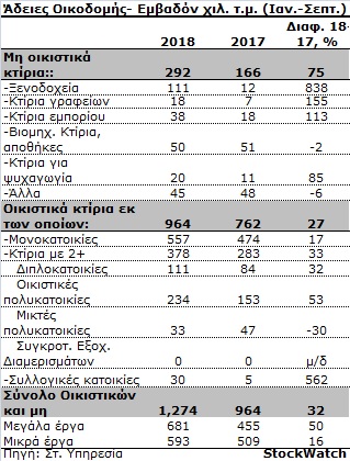 Το σύνολο της αύξησης στις άδειες οικοδομής ανήλθε το εννεάμηνο στο 32%, κυρίως λόγω προώθησης μεγάλων έργων.