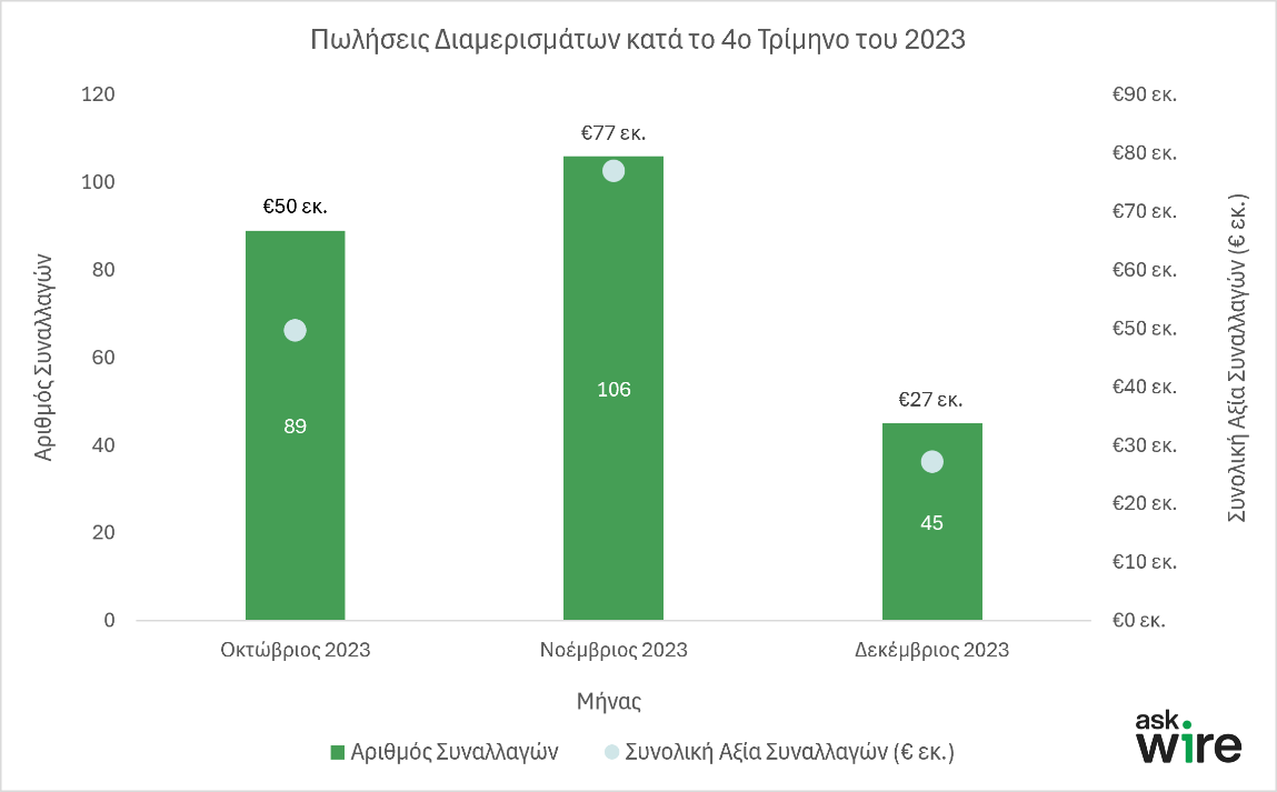 Το τελευταίο τρίμηνο του περασμένου χρόνου ολοκληρώθηκαν 240 πωλήσεις συνολικής αξίας €154 εκατ. Συγκεκριμένα, τον Οκτώβριο ολοκληρώθηκαν 89 πράξεις αξίας € 49,6 εκατ., τον Νοέμβριο 106 πράξεις αξίας € 76,9 εκατ. και τον Δεκέμβριο του 2023 έγιναν 45 συναλλαγές αξίας € 27,2 εκατ.