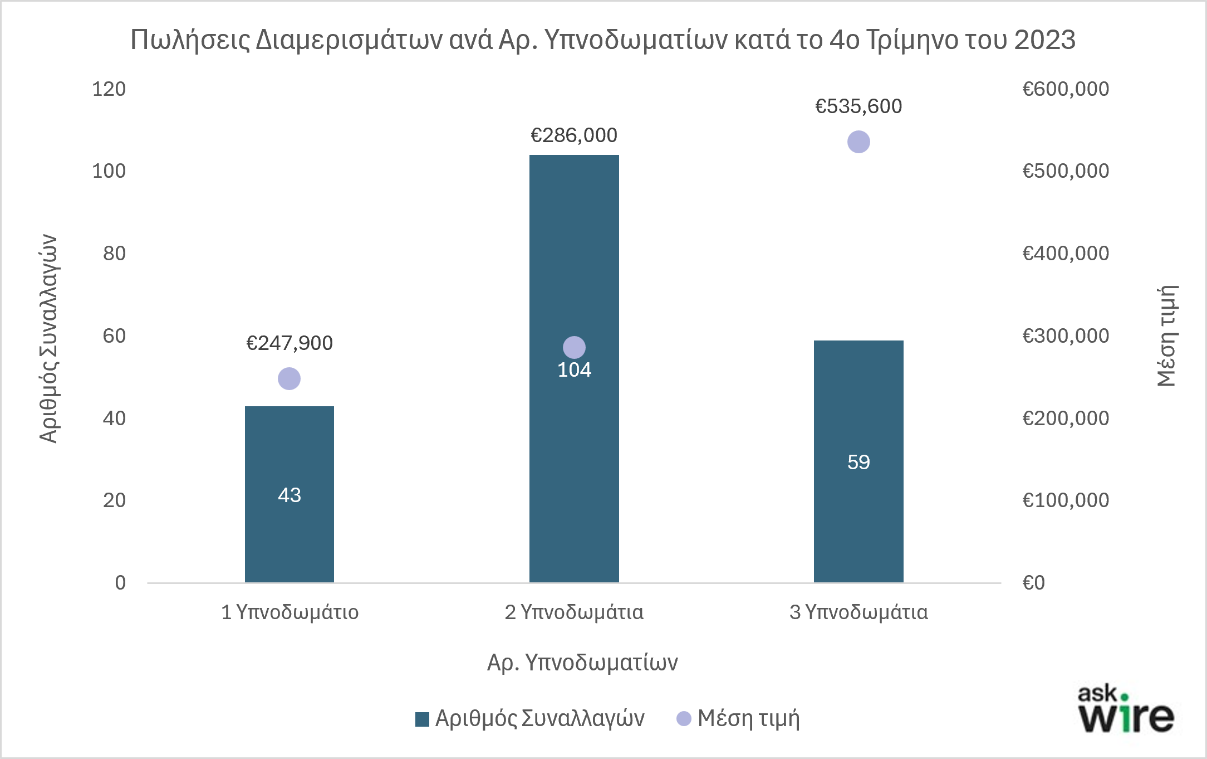 - Διαμερίσματα 1 Υπνοδωματίου: Η συνολική αξία των 43 διαμερισμάτων έφτασε τα €13 εκατ. με τη μέση τιμή πώλησής τους να υπολογίζεται στις €247.900.