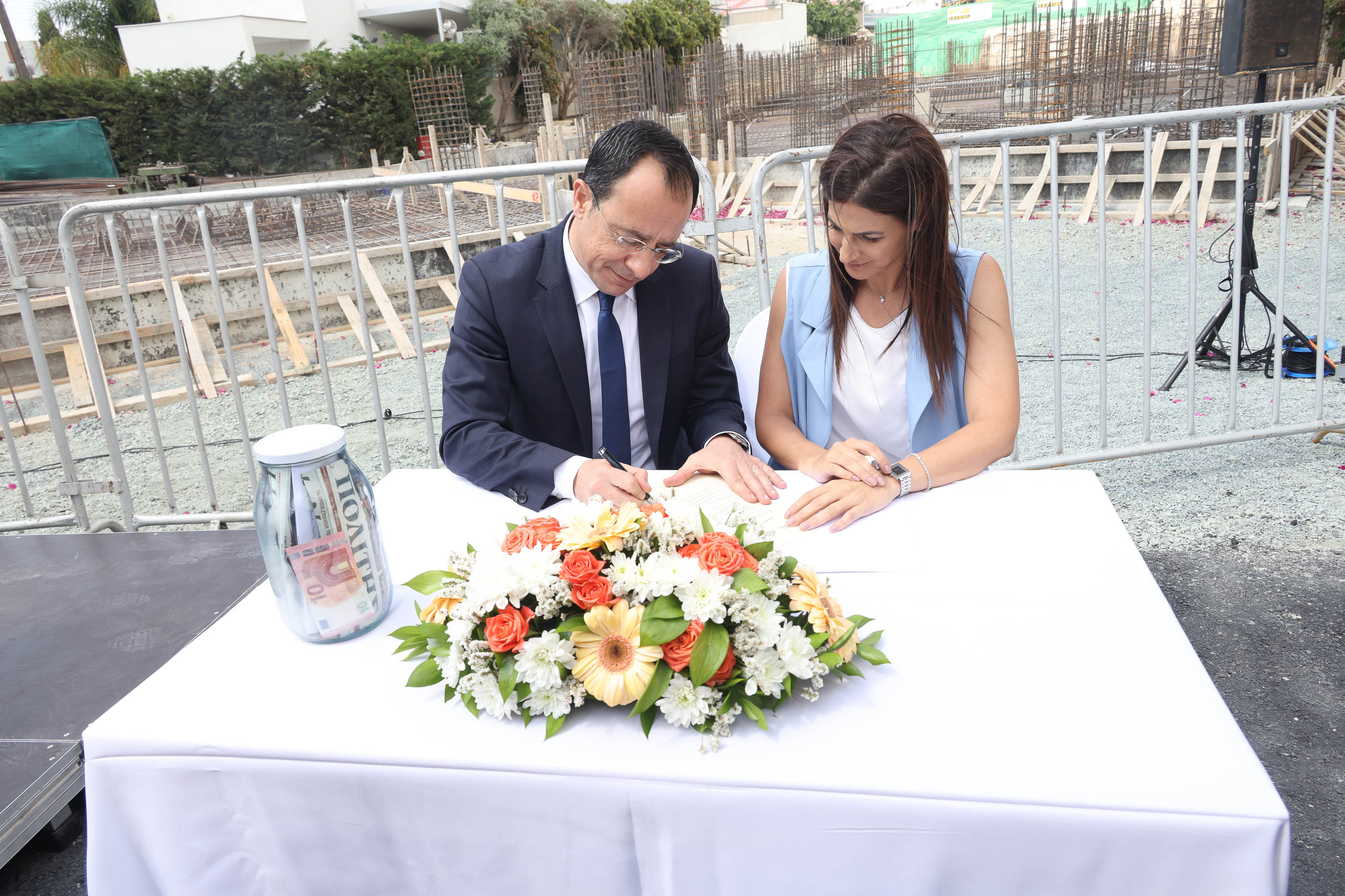 Μετά τους χαιρετισμούς ακολούθησε η υπογραφή της Κτητορικής Πράξης και η κατάθεση του θεμέλιου λίθου από τον Πρόεδρο της Δημοκρατίας Νίκο Χριστοδουλίδη και την Πρόεδρο του Δ.Σ του ΚΟΑΓ Ελενα Κούσιου Χατζηδημητρίου.
